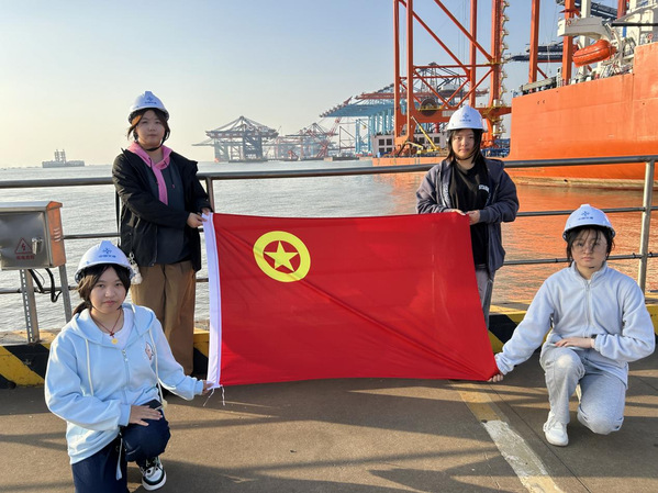 师生团队前往振华重工崇明基地开展工业研学。在0号码头,师生近距离观摩重型机械的作业现场,感受现代制造业的精准与力量;随后通过企业宣传片进一步了解振华重工的发展历程与创新成就。在29层观景平台上,整个生产基地的壮阔图景尽收眼底,师生深切体会到“大国重器”所承载的科技实力与奋斗精神。