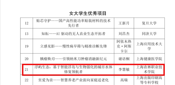 近日,“巾帼新力量 慧创赢未来”2025年上海市女大学生创新创业大赛获奖结果正式公布,我院“浮屿生态:基于智能浮岛与生物强化的城市水体修复领航者”项目荣获女大学生优秀项目,学院荣获优秀组织奖(集体),张楠老师荣获优秀组织奖(个人)。