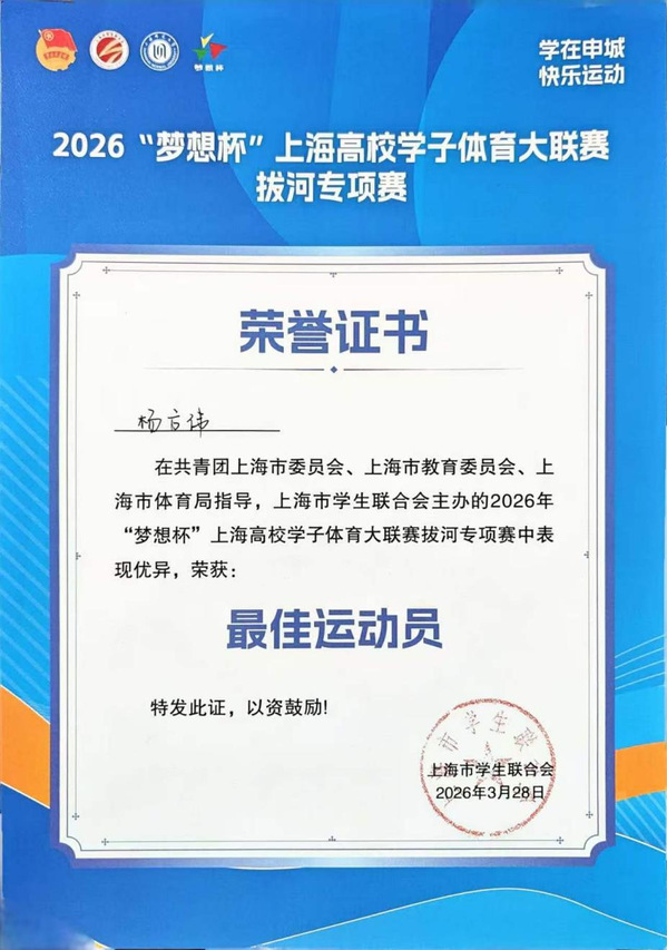 2026年3月28日,“梦想杯”上海高校学子体育大联赛拔河专项赛在上海师范大学火热开赛。我院代表队意气风发,以饱满的热情和昂扬的斗志参与此次赛事,在赛场上展现了农林学子团结协作、奋勇拼搏的青春风采。我院杨方伟同学获得“优秀运动员”奖。